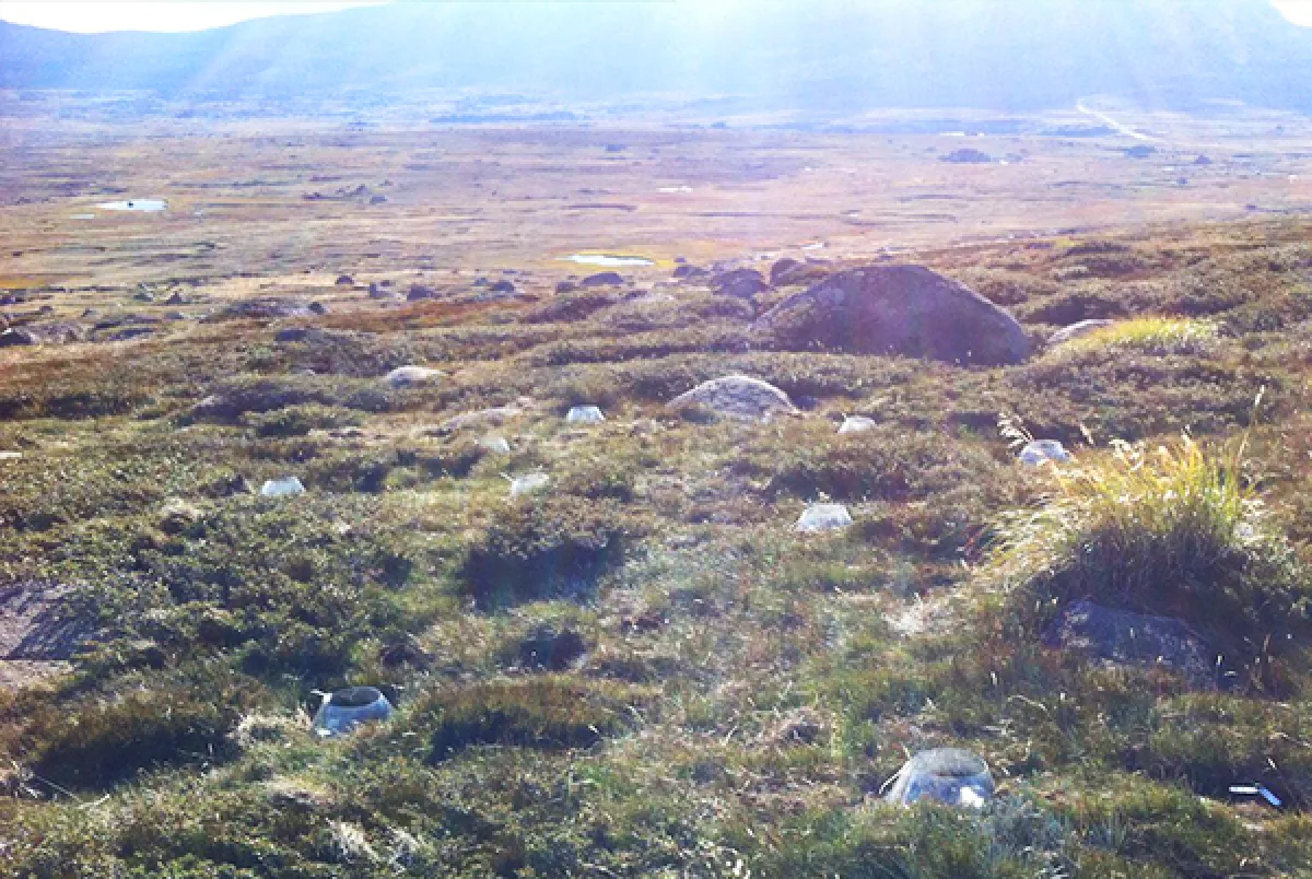 Photo: Miniature open top chambers in Kosciuszko National Park for an experiment examining the effect of maternal environment during seed development and warming during seedling stage on growth and physiology of Aciphylla glacialis (alpine celery).